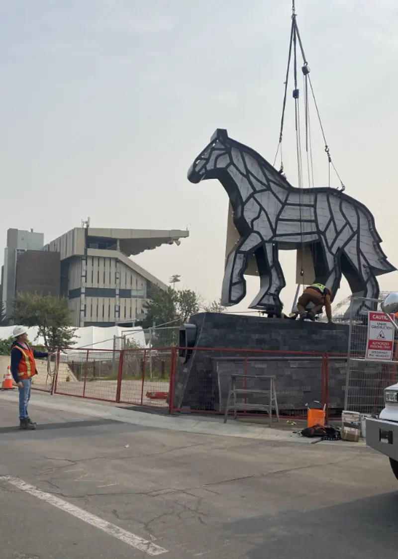 The stone veneer cladding the Gatekeeper plinths is sourced from local quarries in Alberta, staying true to authenticity and sustainability. This choice supports regional craftsmanship and creates a lasting connection between the artwork and the landscape it honours.