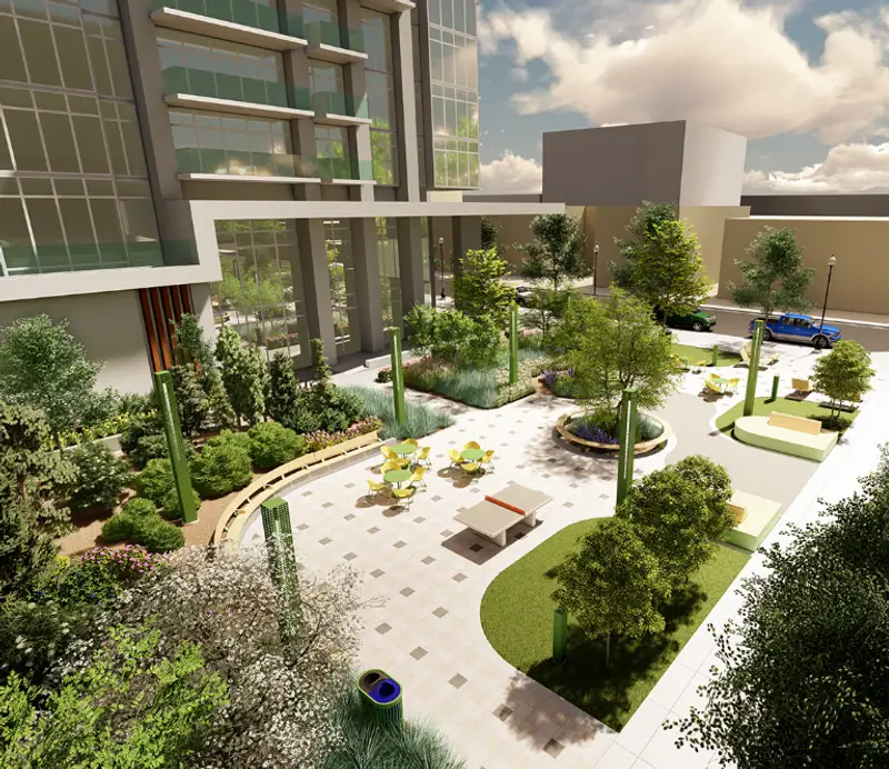 Before redesign, the Lois Szabo Commons site lacked color, vibrancy and functionality. Despite a prime location, it fell short on common areas, green spaces and walkability. Edges also lacked definition and made the parameters unclear and uninviting.
