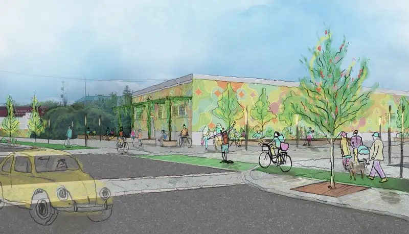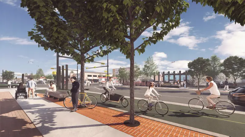 Narrowed streets, widened connections: Reviving a once-industrial corridor to benefit neighbours, nature and the next generation of transit.