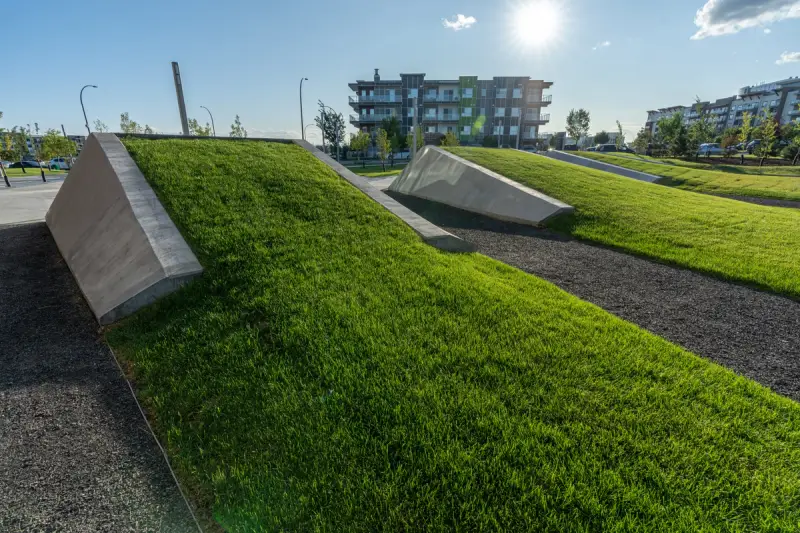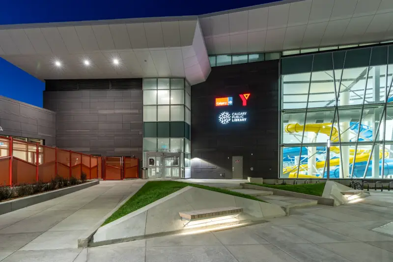 groundcubed prioritized cohesiveness between outdoor and indoor spaces. Sprawling plazas connect three main entry points, each designed for active and passive gathering. Public realm features include a sunken lawn, amphitheatre, reading garden, and playful hillside slide near the daycare. Inside the world’s largest YMCA, you'll find two NHL-sized arenas, a triple gymnasium, state-of-the-art fitness studios, running tracks, aquatic zones, theatres, retail, and much more.
