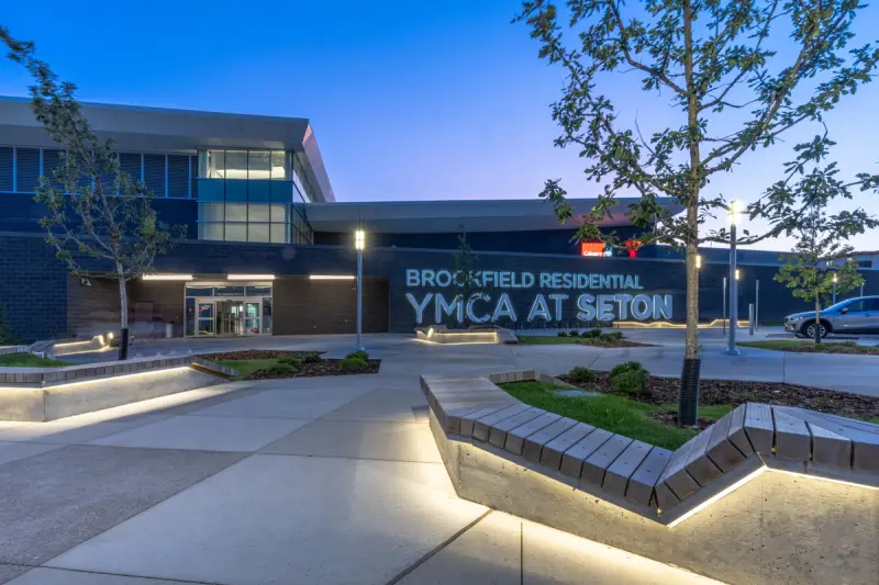 Opened in 2019, the Brookfield Residential YMCA at Seton represents a landmark in integrated community design benefiting a range of user groups — from athletes and performers to students and commuters. Focused on efficient multimodal transportation and exterior amenity design, we partnered with GGA on a master plan that integrates diverse programming, including a 330,000-square-foot recreation facility, high school, massive storm pond, and underground LRT station.